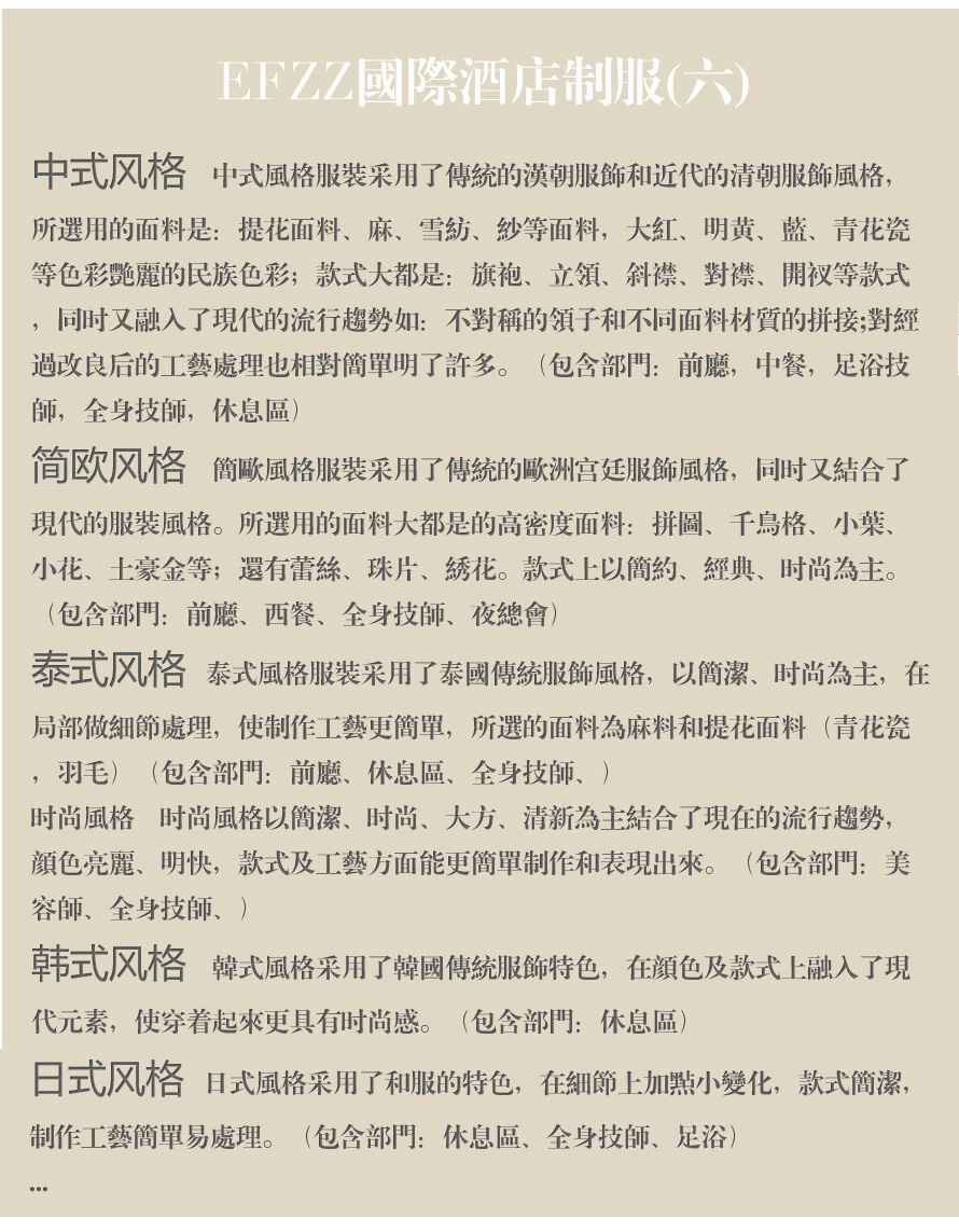 EFZZ國際酒店制服內容:酒店餐飲制服、美容水療會所制服、夜場小姐KTV制服、風格泰式、東南亞、韓式、日式、楚漢風格。