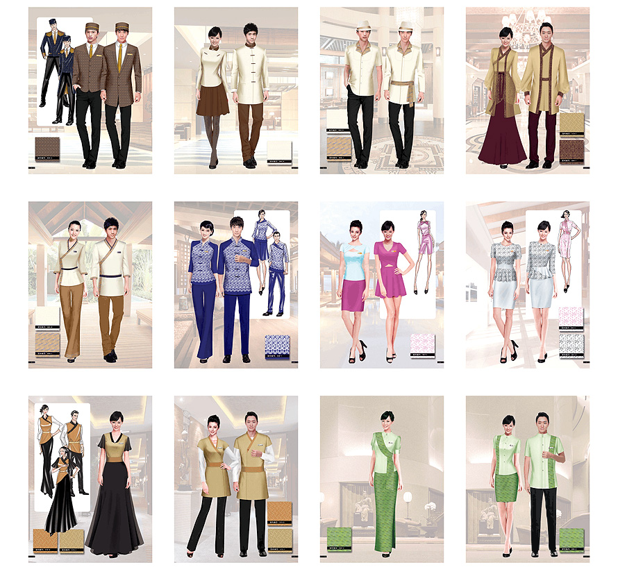 1.中式風格,中式風格服裝采用了傳統的漢朝服飾和近代的清朝服飾風格,所選用的面料是:提花面料、麻、雪紡、紗等面料,大紅、明黃、藍、青花瓷等色彩艷麗的民族色彩;款式大都是:旗袍、立領、斜襟、對襟、開衩等款式,同時又融入了現代的流行趨勢如:不對稱的領子和不同面料材質的拼接;對經過改良后的工藝處理也相對簡單明了許多。(包含部門:前廳,中餐,足浴技師,全身技師,休息區);